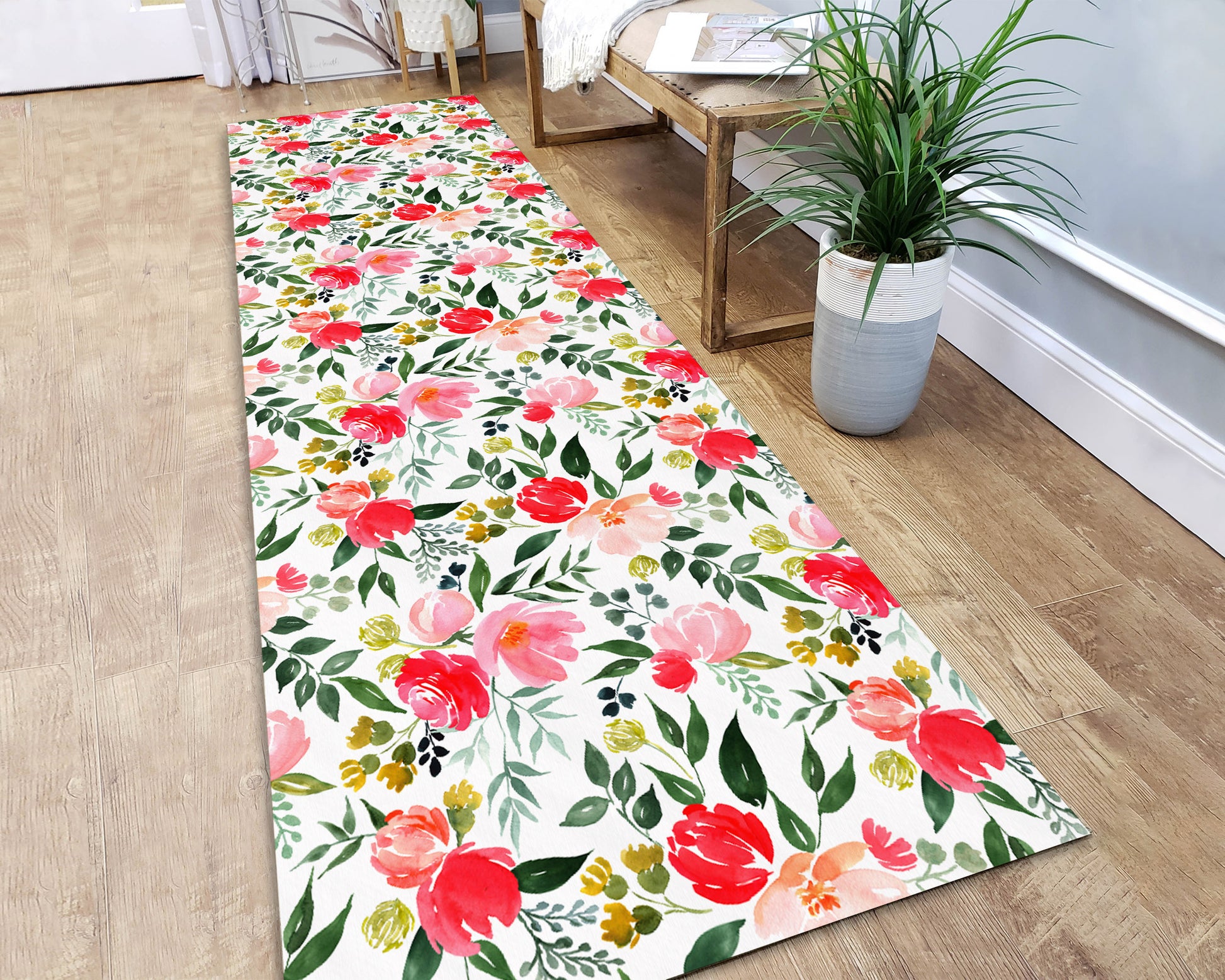 Pink Flower Pattern Runner Rug, Boho Style Kitchen Runner Mat, Hallway Runner Carpet, Floral Rug