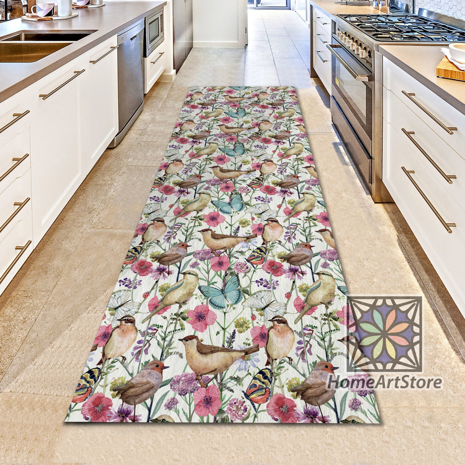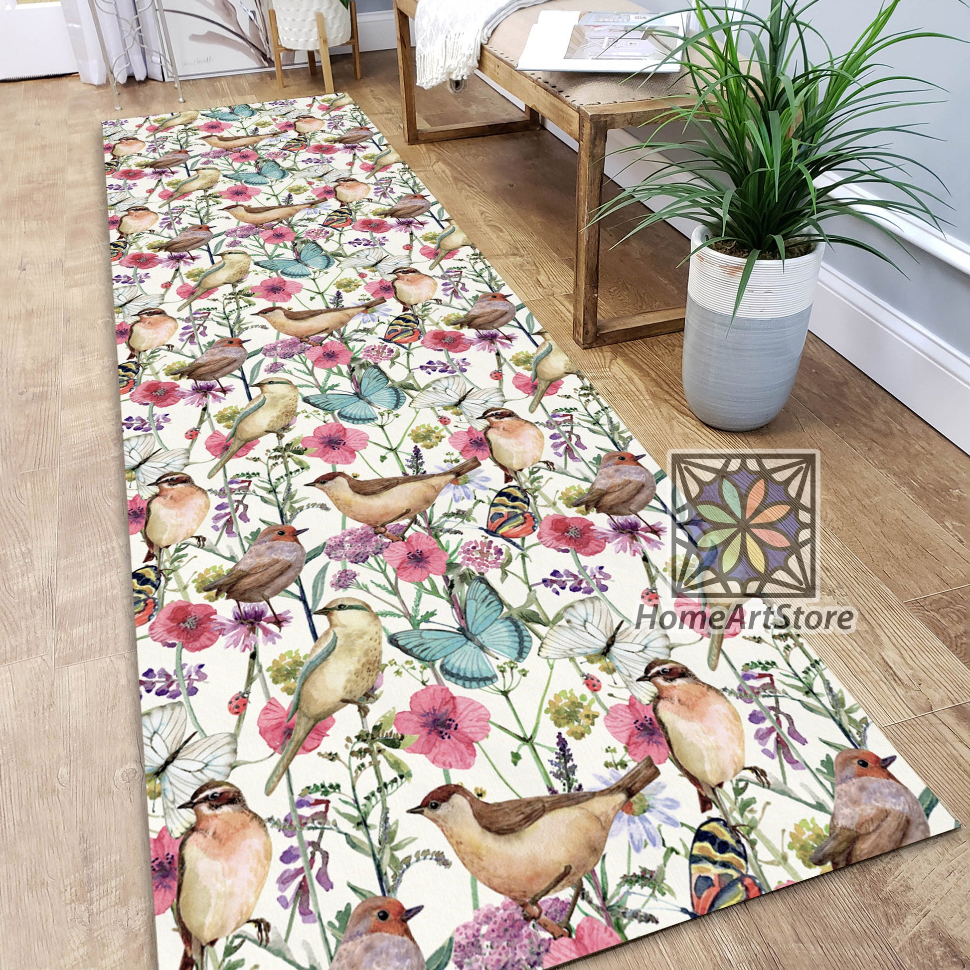Pretty Birds Themed Rug, Meadow Flower Carpet, Kitchen Runner Rug, Hallway Runner Mat, Floral Runner Rug, Nature Decor