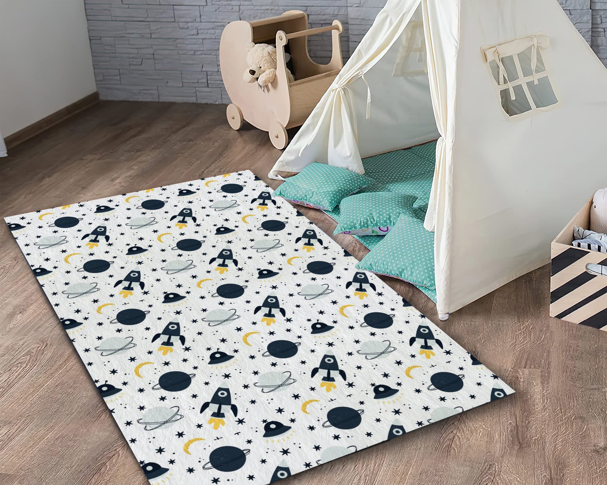 Rocket Pattern Rug, Kids Room Carpet, Galaxy Decor, Nursey Mat, Moon, Planets, Stars Themed Rug