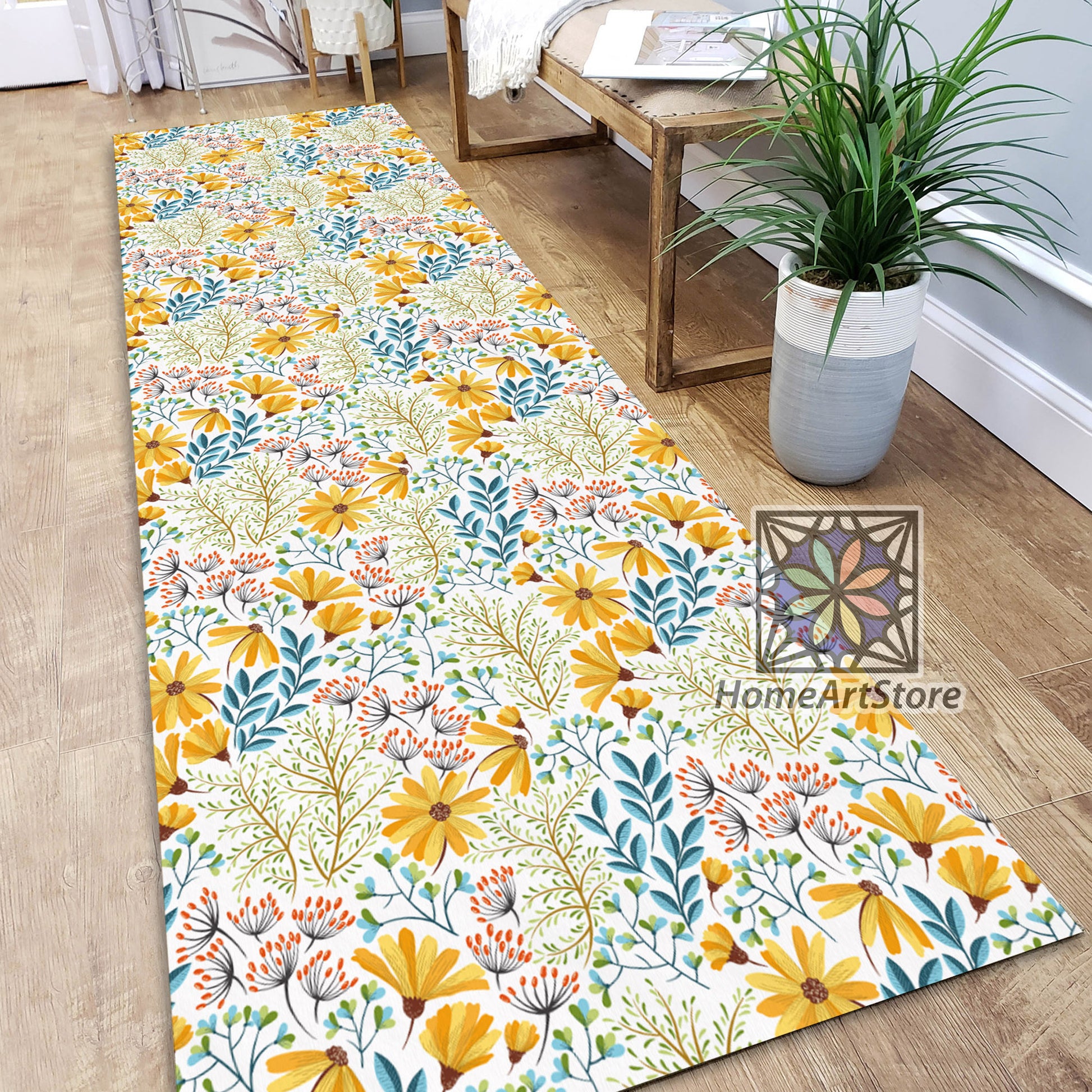 Spring Floral Runner Rug, Kitchen Runner Mat, Hallway Runner Carpet, Yellow Flower Runner Rug, Boho Carpet