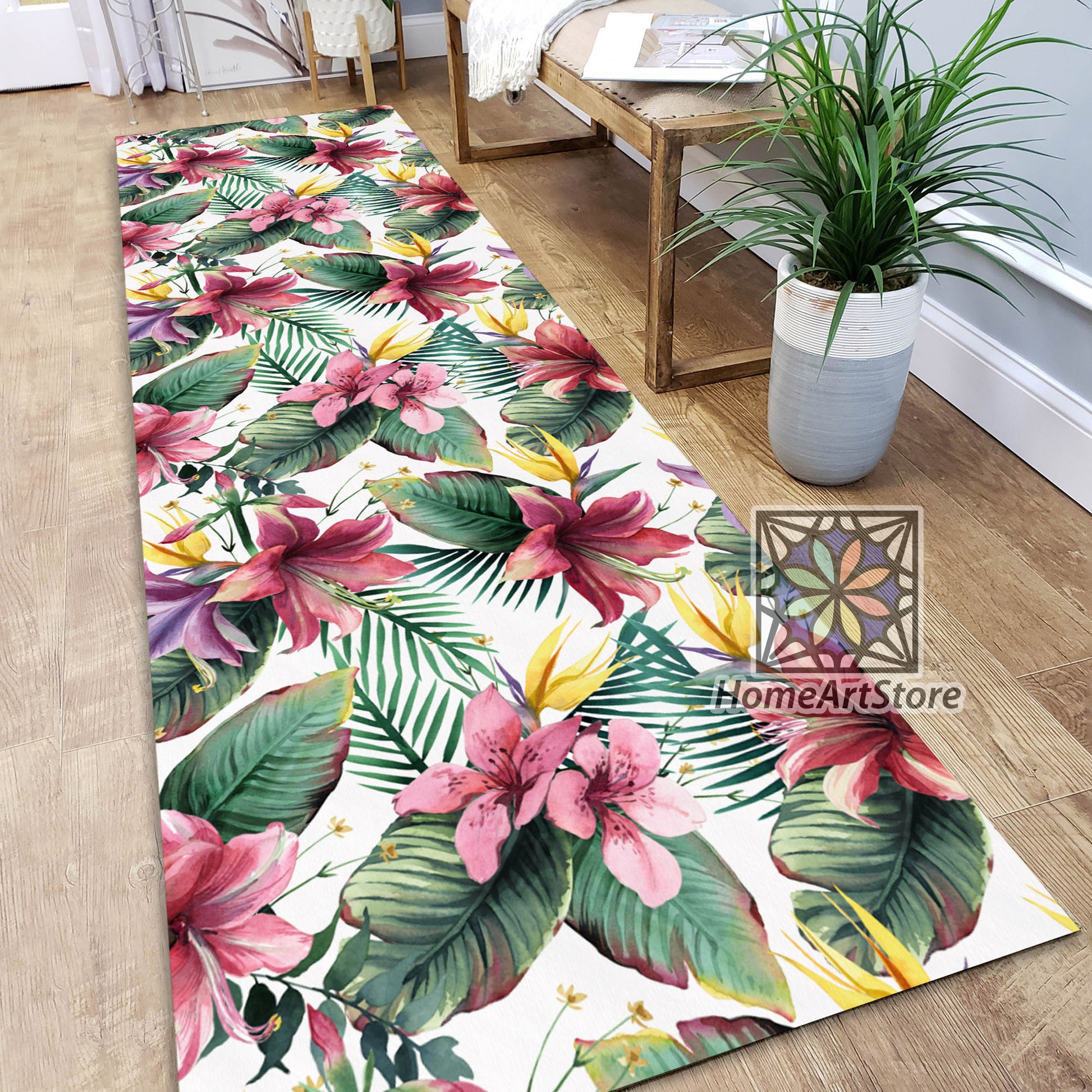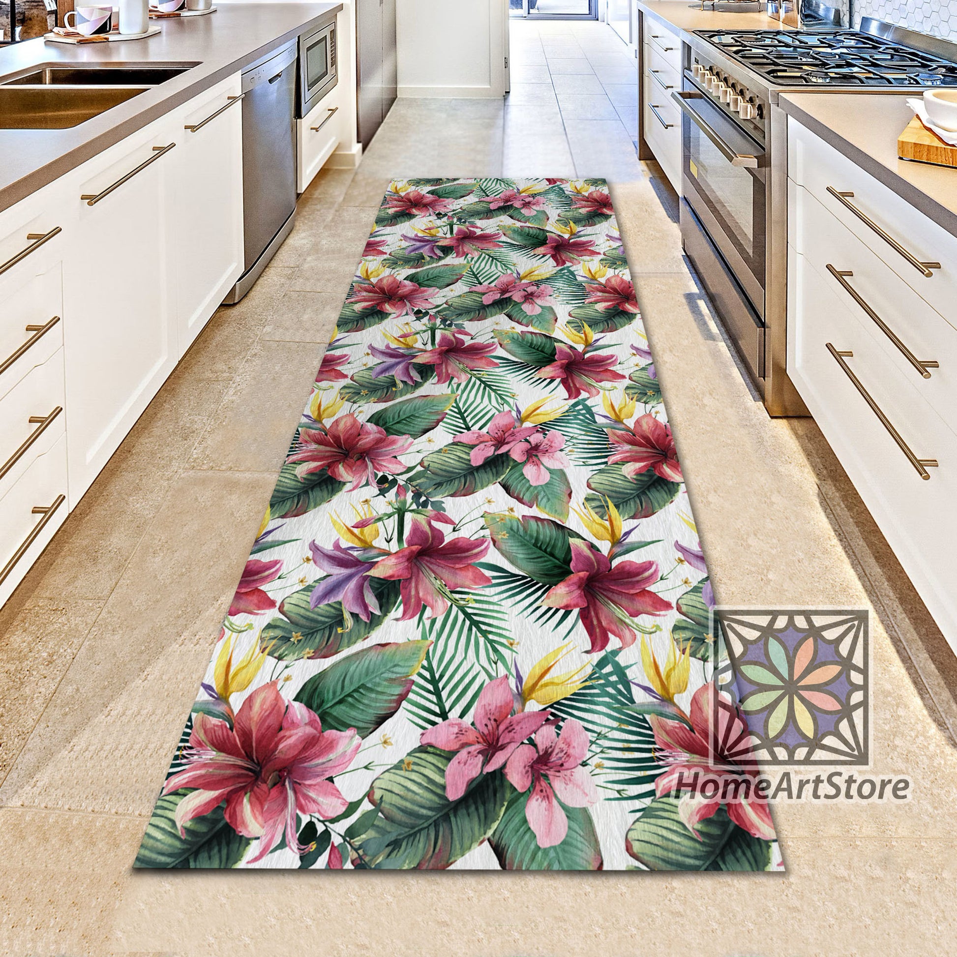 Tropical Runner Rug, Colorful Flowers Hallway Carpet, Floral Runner Mat, Kitchen Decor